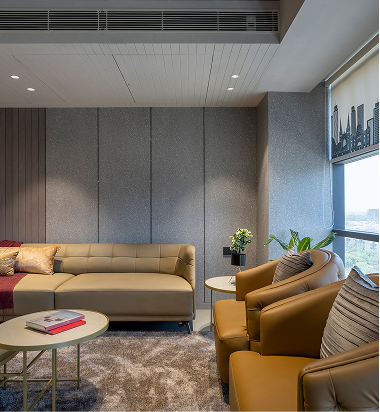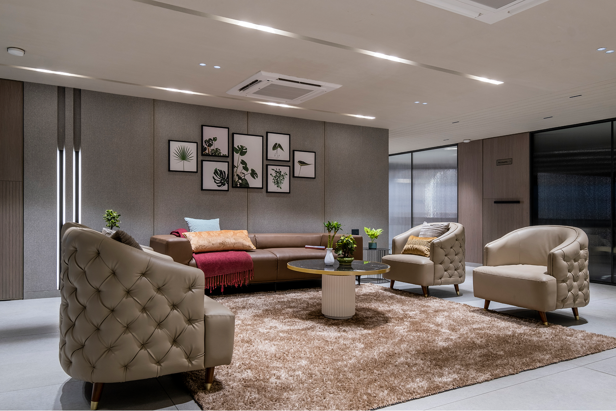 The brief was to design a corporate office that blends professionalism with a sense of calm and cultural grounding. The client wanted a workspace that felt modern and elegant, yet rooted in tradition, incorporating mindful elements without appearing conventional. Another key requirement was to give individual cabins their own identity while maintaining a cohesive design language throughout the office.