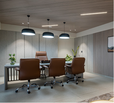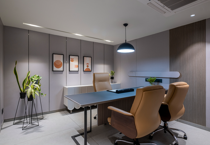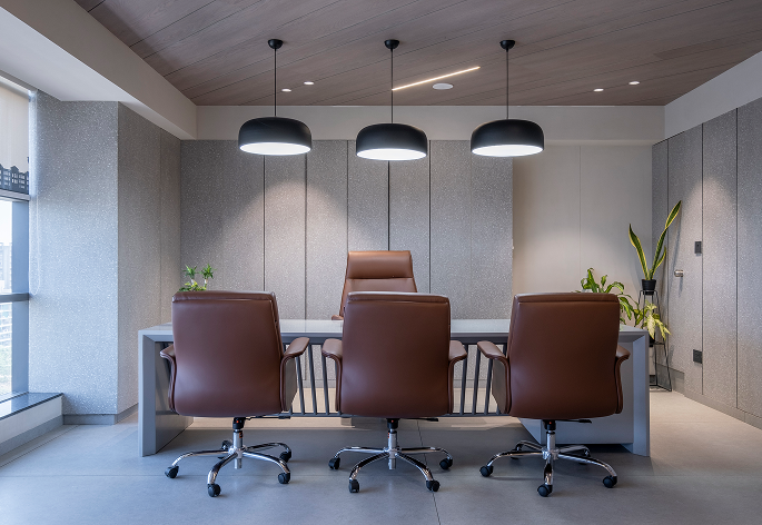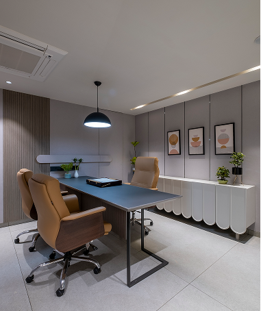 The design journey focused on harmony between contemporary design and traditional values. A modern arched deity niche with soft profile lighting was introduced to create a serene focal point. Thoughtful zoning ensured smooth workflow, while a recreational area was added to encourage relaxation and collaboration. Each cabin was designed distinctly—the principal director’s cabin with bold angular ceiling lines and rustic charcoal walnut finishes, and the junior partner’s cabin with softer tones and finishes. Details like concealed handles, indoor plants, and vibrant furniture accents added depth.