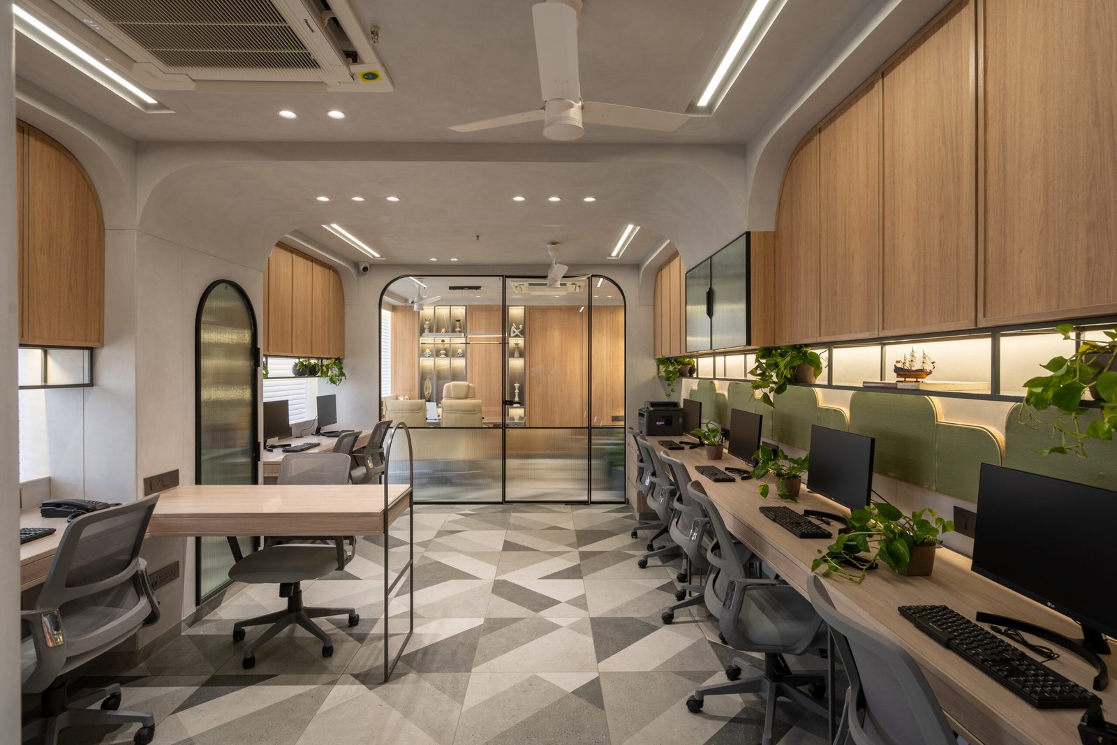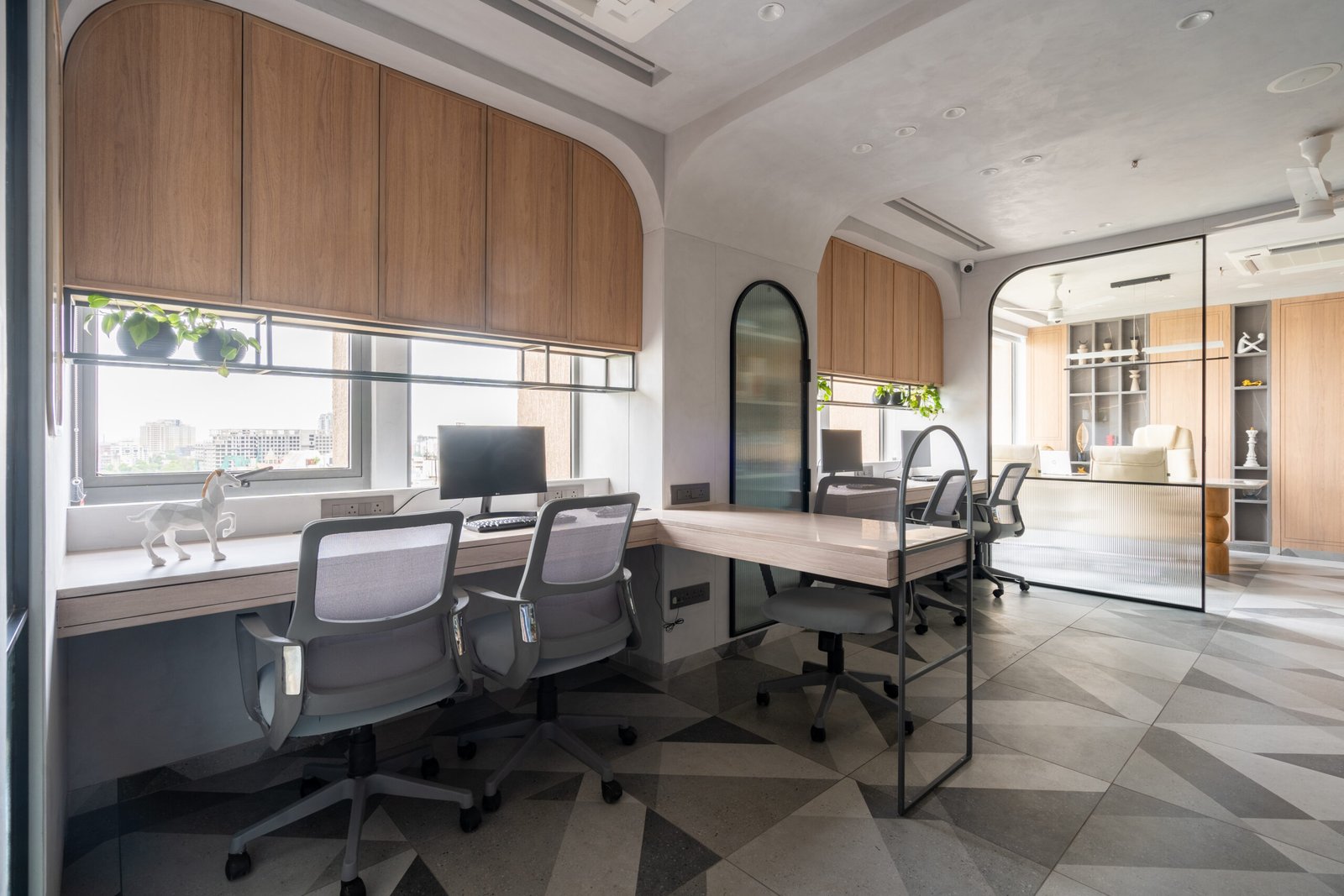 Sanctuary is a thoughtfully designed office space that reimagines the modern workplace. Rooted in the idea of bringing the outdoors in, the space embraces natural materials, tactile textures, lush greenery, and expansive windows overlooking Ahmedabad’s treetops.