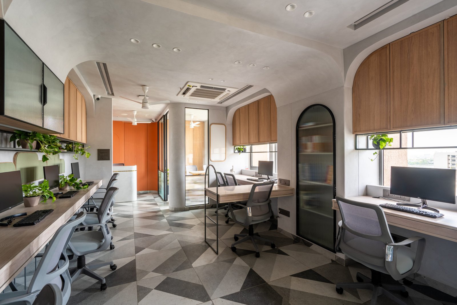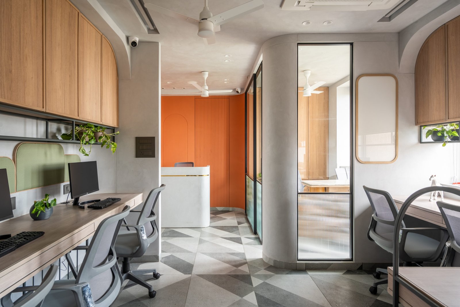 A bold orange reception wall establishes a strong first impression, balanced by earthy greens and refined details. Private cabins were designed with custom furniture, curated art, and floor-to-ceiling windows, creating environments that support productivity and imagination.